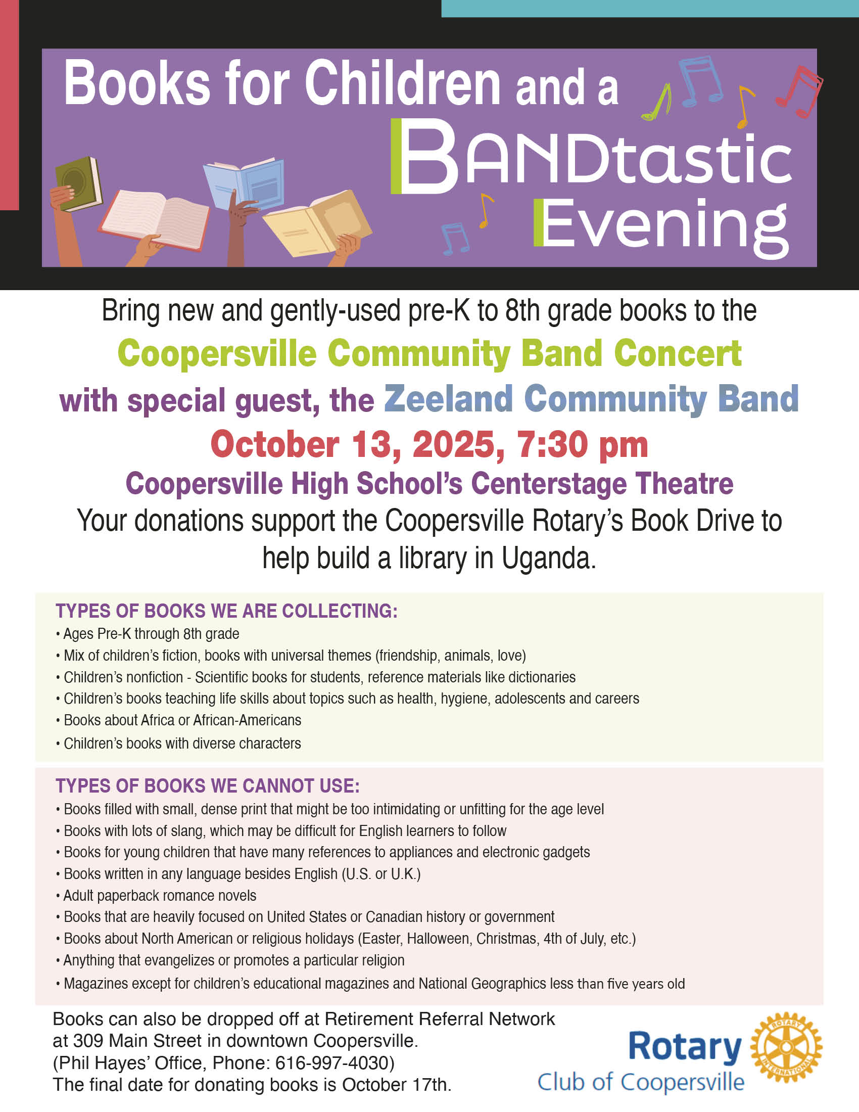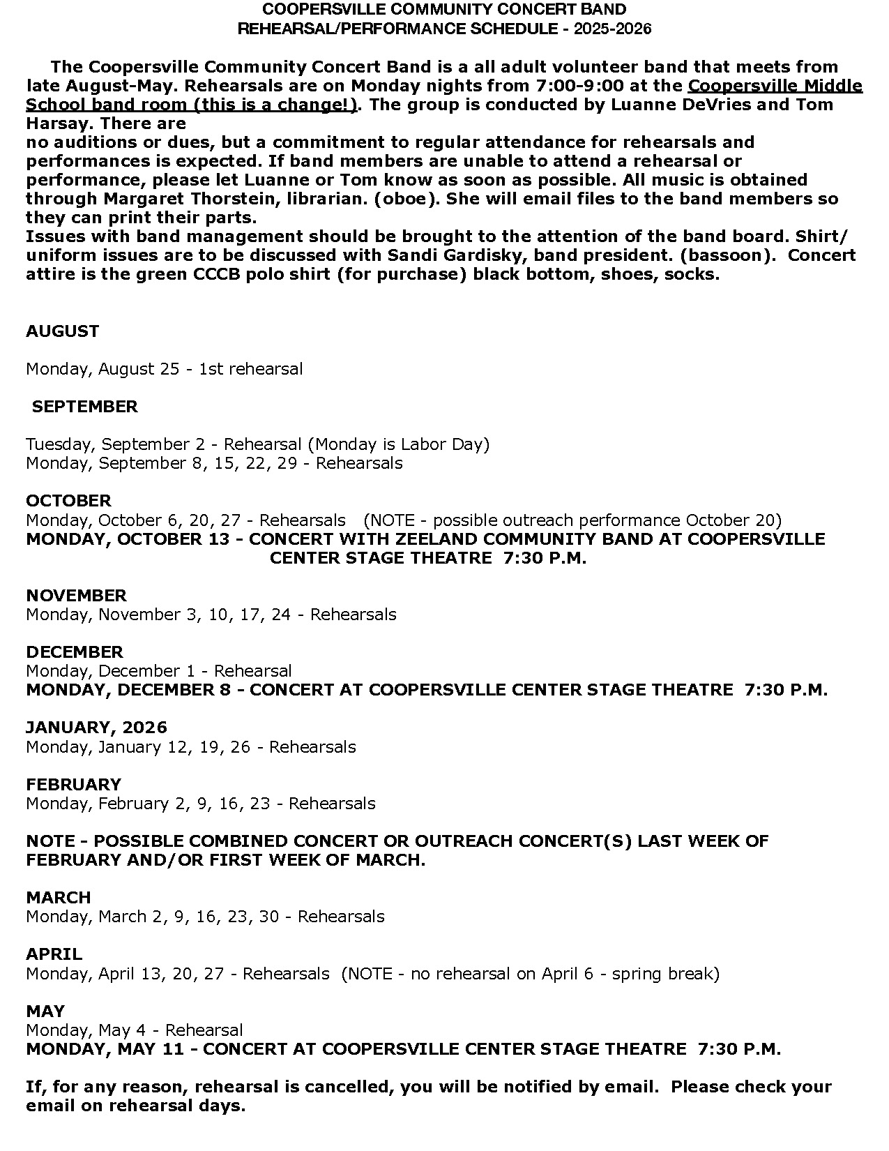 Be sure to mark your calendar for a fun evening of music on Monday night, December 8, starting at 7:30 PM. Doors open at 7:15 PM. Concert will be held at the Centerstage Theater within Coopersville High School. Everyone is welcome. Free Admission. Visit https://coopersvilleccb.org/ for more information about the band.